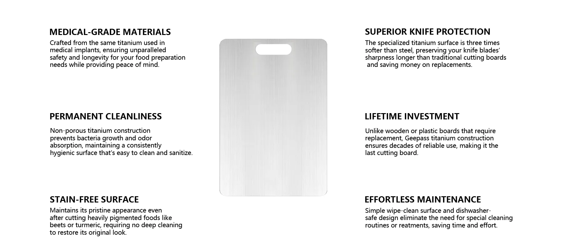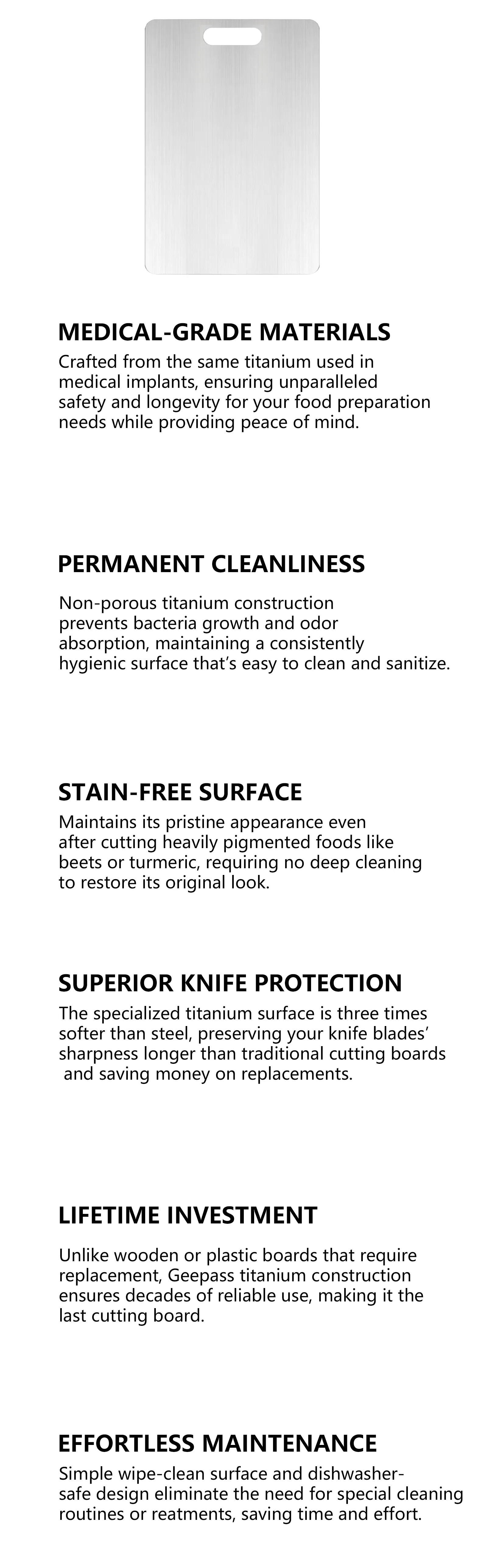 With proper care, the medical-grade titanium construction ensures a lifetime of use. It won’t degrade, warp, or require replacement like traditional boards.
